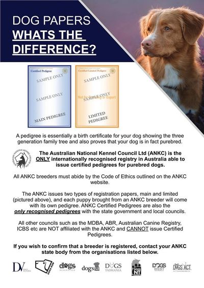 All other registries such as the MDBA, ABR, Australian Canine registry, ICBS etc are NOT affiliated with the ANKC and CANNOT issue Certified Pedigrees. If you have doubts a breeder is registered, contact your ANKC State Office to confirm.